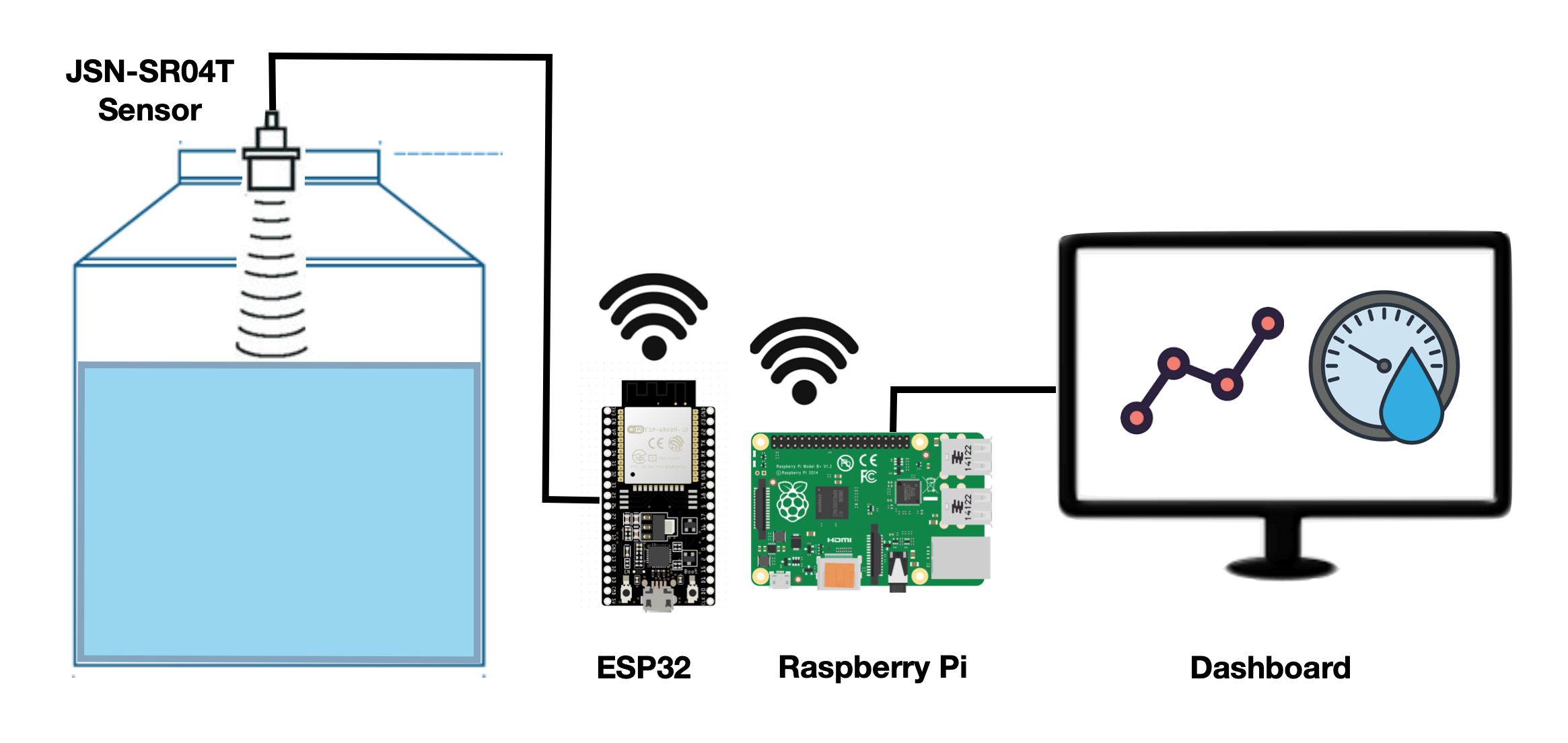 The JSN-SR04T is a waterproof ultrasonic sensor placed in the lid of the water tank. It takes measurements every 5 minutes and calculates the distance from the lid to the water level inside the tank. It then transmits that information to an ESP32 micro controller.